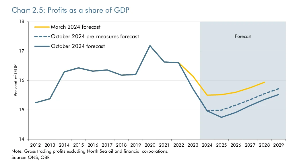 The OBR added: “The rise in employer NICs in this Budget will further erode profits and we assume firms are only able to pass on around 60 per cent of the cost to employees in the short term. We then expect the profit share to rise gradually from 2026 as firms rebuild margins and pass on more of the cost of the rise in employer NICs to higher consumer prices and lower nominal wages.”