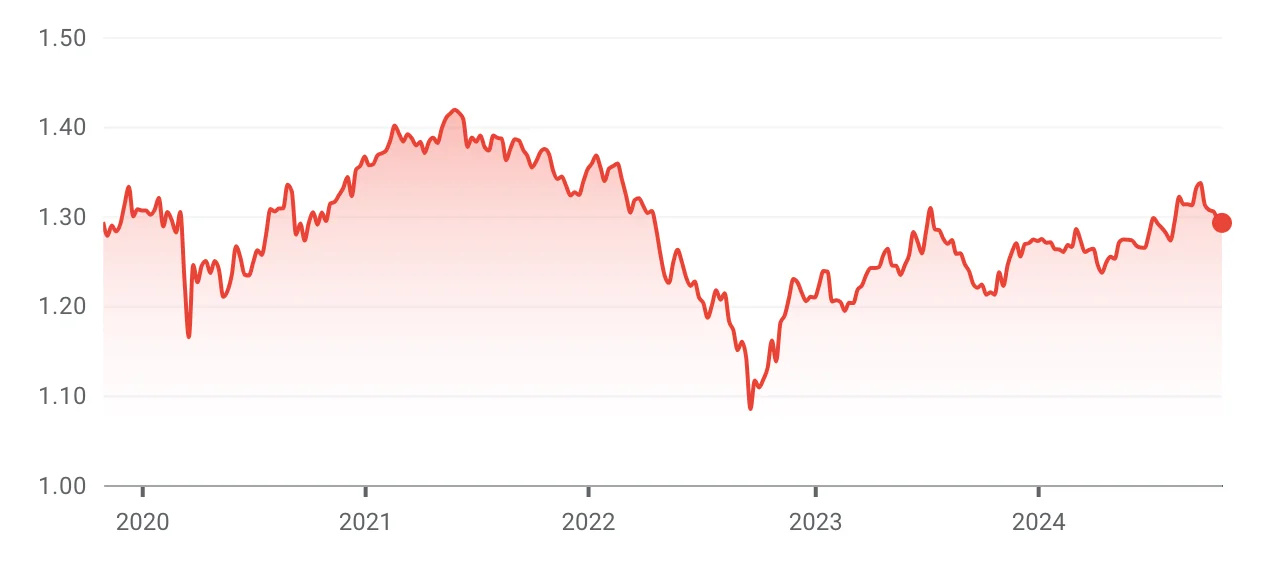 The graph below shows the pound against the dollar over the last five years. As you can see, while markets have been wobbly this week, we are a long way from the tumultuous days of late 2022 after Liz Truss and Kwasi Kwarteng’s mini-Budget.