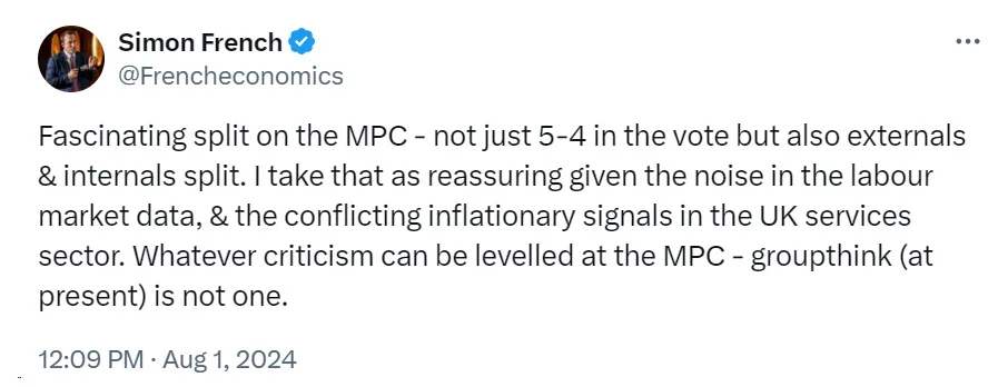 At its meeting on 31 July, the monetary policy committee voted by a majority of five to four to reduce the inflation rate by 0.25 percentage points. Four members voted to maintain the rate. In its reasoning, the BoE says inflation has fallen to its target of 2 per cent, private sector weekly earnings growth has slowed to 5.6 per cent and services inflation had declined to 5.7 per cent, while GDP growth momentum “appears weaker”.
