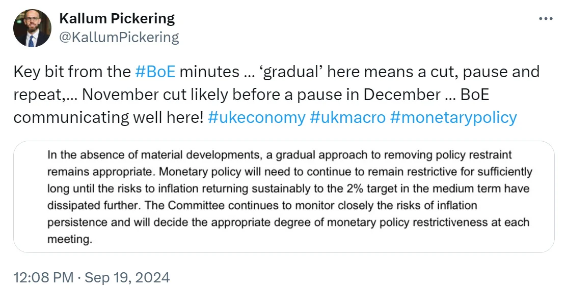It concludes: “In the absence of material developments, a gradual approach to removing policy restraint remains appropriate. Monetary policy will need to continue to remain restrictive for sufficiently long until the risks to inflation returning sustainably to the 2 per cent target in the medium term have dissipated further.”
