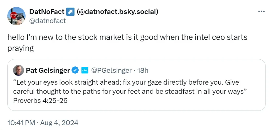 That follows losses for Wall Street on Friday, when tech firms were particularly hit as investors pulled back from a rally fuelled by optimism over AI. Amazon shares fell by more than 9 per cent on the back of weaker-than-expected revenues, one of the biggest one-day falls for the company in recent history. But it was worse for Intel, which dropped by more than a quarter, its biggest one-day fall since 1982, seemingly prompting this tweet from its CEO: