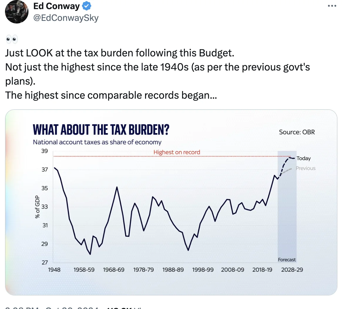 The reason that the OBR is expecting private consumption to be hit is that is that the tax burden is heading to the highest level on record. This graph is from Sky’s Ed Conway.