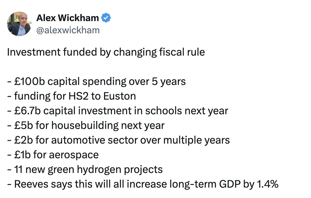I will give the final word to the brilliant Paul Johnson at the Institute for Fiscal Studies, the think tank. Johnson is always quickly on top of the Budget numbers. He highlights that the government is now looking to borrow £28bn more in the 2025-26 financial year than previously planned. But only £19bn of that is earmarked for public investment (like rail infrastructure). The rest is for day-to-day spending.