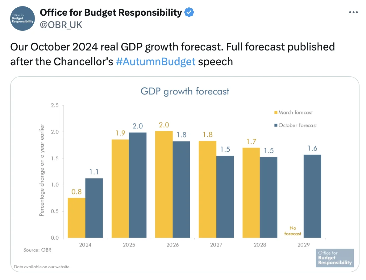 And this graph shows the new forecasts for GDP (blue bars) compared to the OBR’s last forecasts in March under the Conservative government (yellow bars).