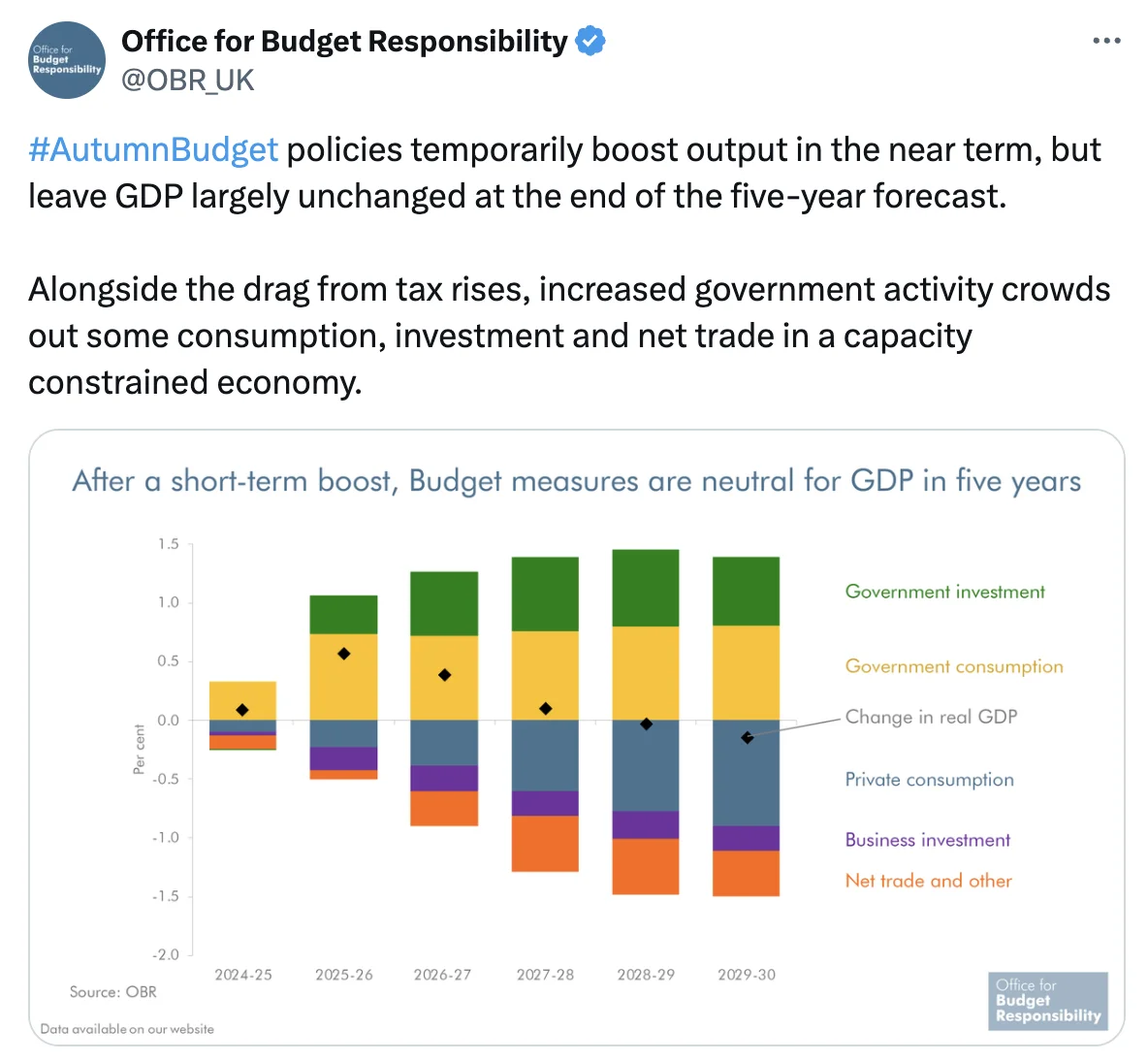 The irony of all these changes to tax and spending is that the Office for Budget Responsibility, the UK’s fiscal watchdog, has forecast that the Budget will barely change GDP over the next five years. There will be a short-term boost from public spending and investment going up, but this will be offset over five years as private consumption and business investment is hit.